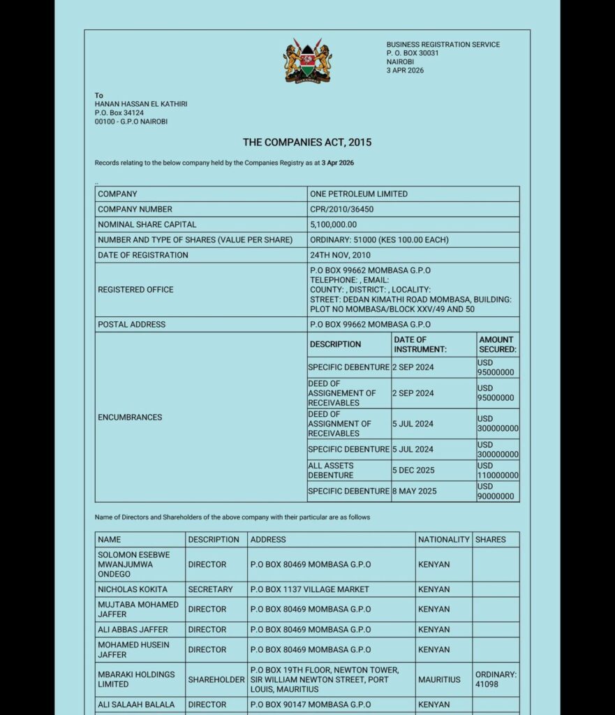 At the center of the storm sits ONE Petroleum Limited, a Mombasa-registered petroleum trading company whose ownership and control structure, according to official Companies Registry documents, connects to prominent figures in the coastal business elite and a network of shareholders stretching as far as Mauritius.