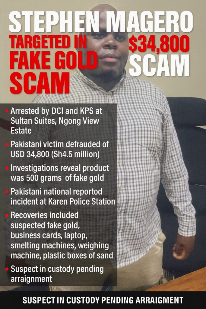 Detectives from the Directorate of Criminal Investigations (DCI) in a joint operation with officers from the Kenya Police Service (KPS) have arrested a suspected fraudster, Stephen Magero, in connection with a multi-million shilling fake gold scam targeting a Pakistani national.