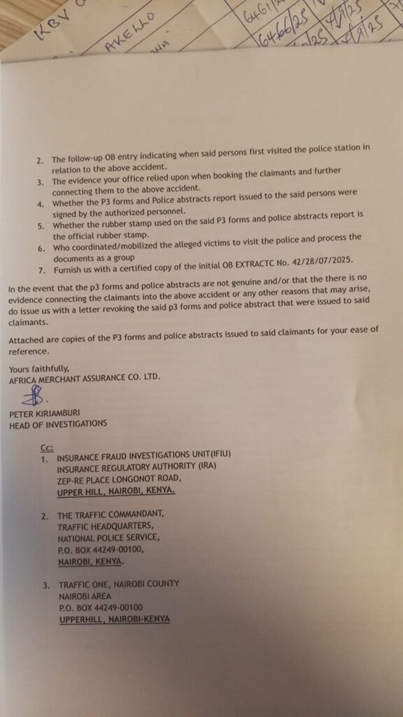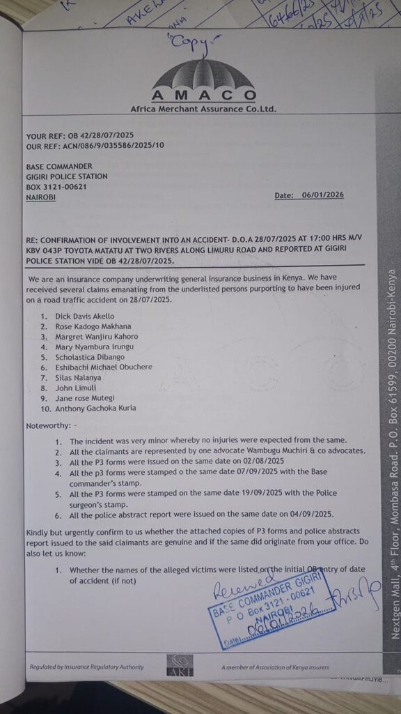 In a letter dated January 6, 2026, AMACO formally wrote to the Base Commander of Gigiri Police Station requesting verification and authentication of the documents that had allegedly been presented to support the injury claims.